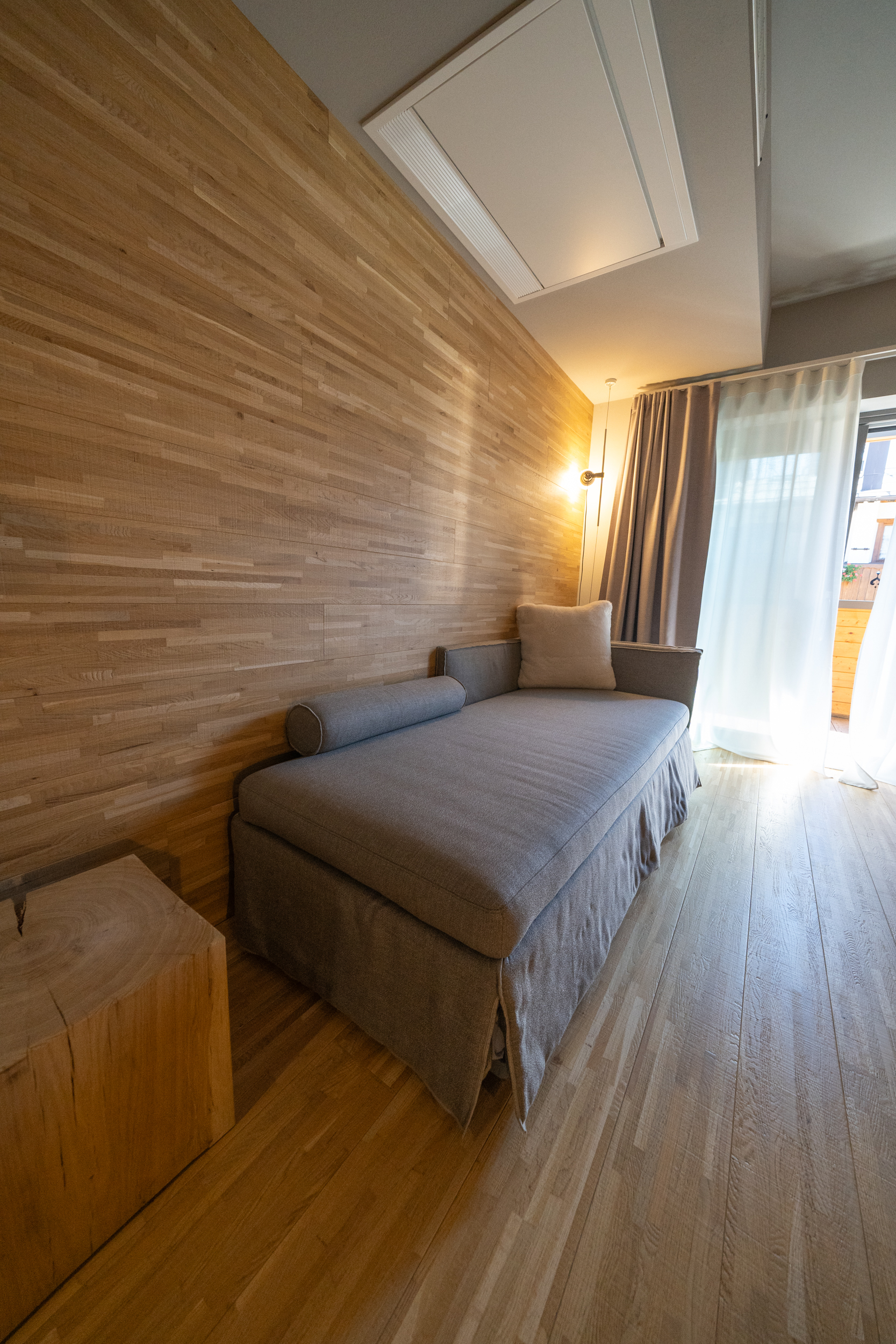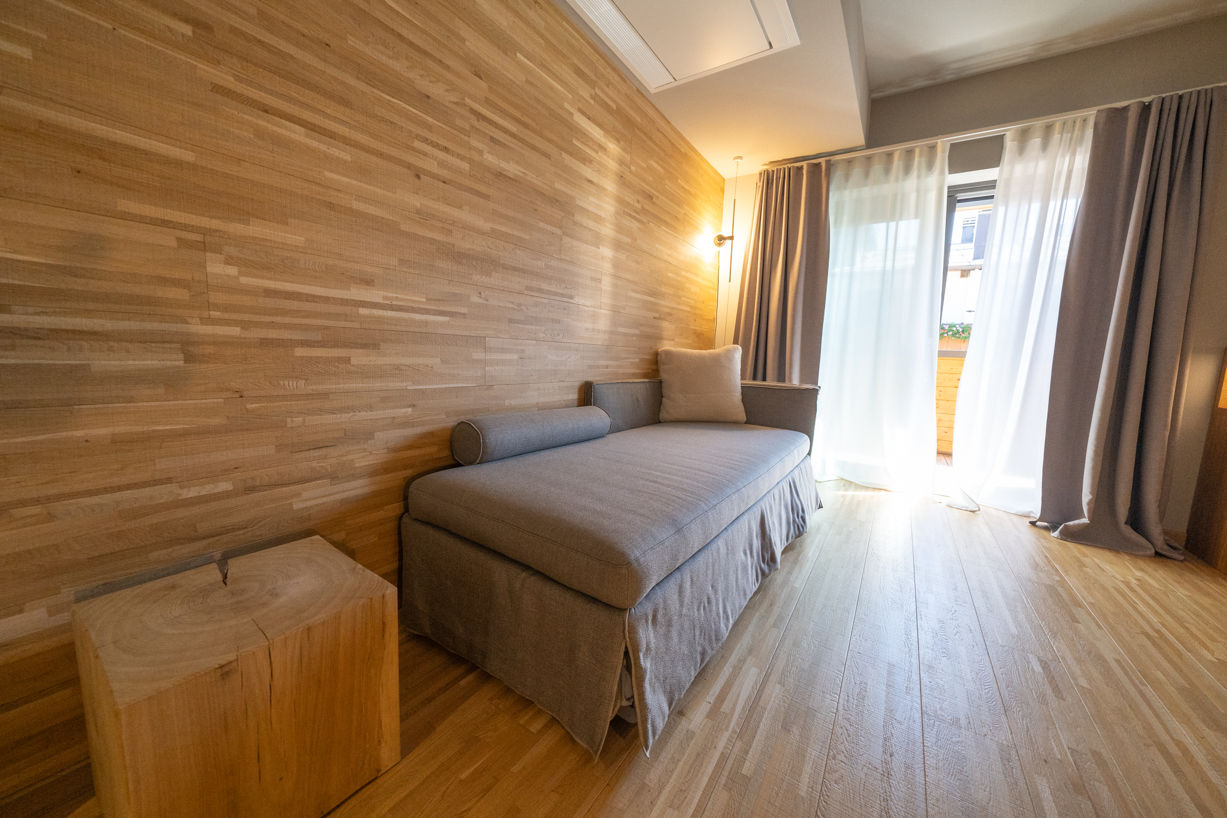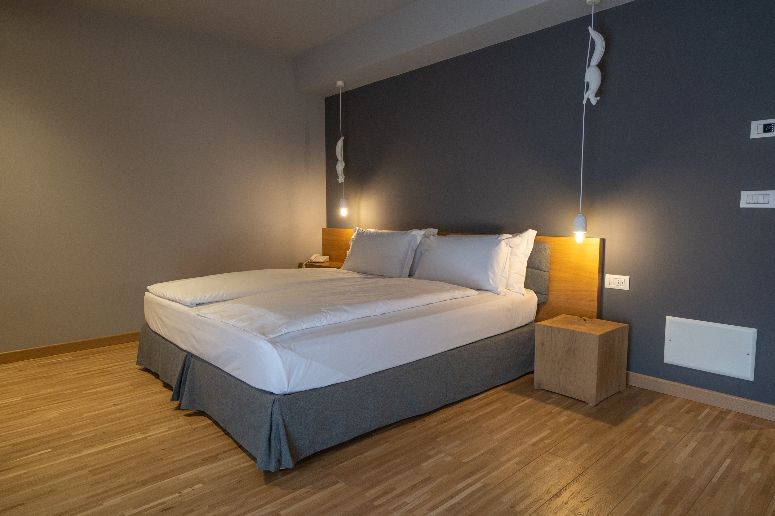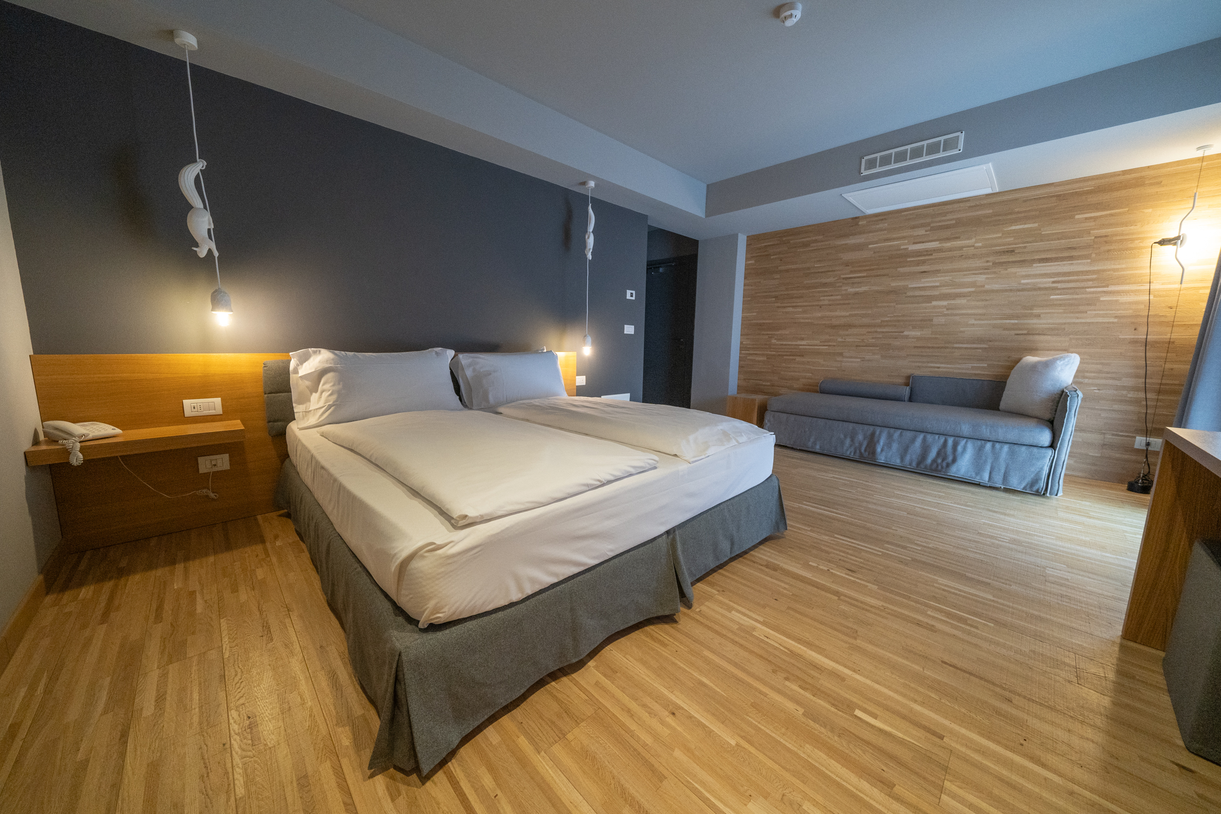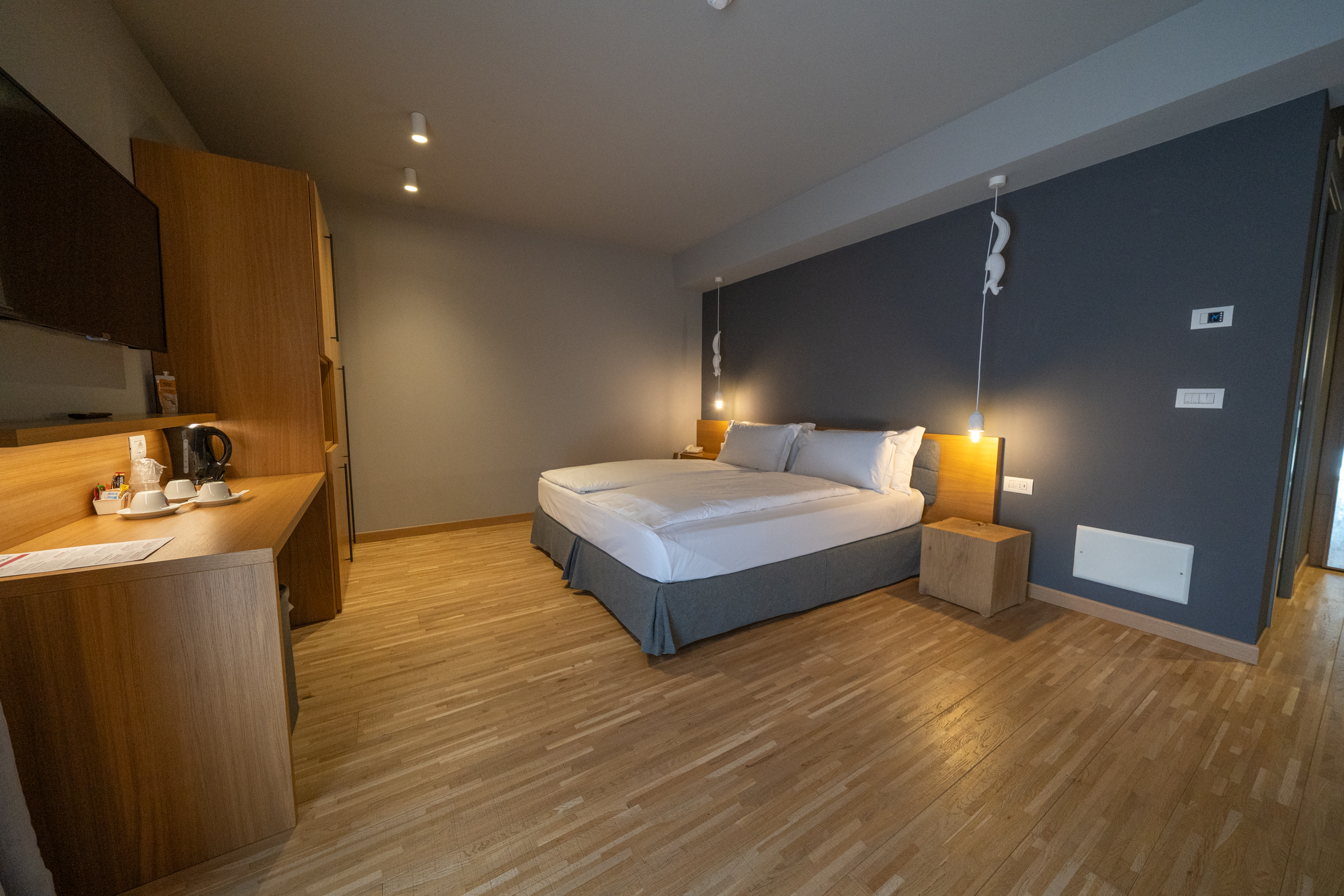 Camera con letto matrimoniale letti separabili, divano letto e possibilità di richiedere un letto aggiuntivo. Terrazza privata che si affaccia sul lato tranquillo dell’ hotel e con vista parziale del Monte Siera. Su richiesta il lettino da viaggio (0-3 anni).