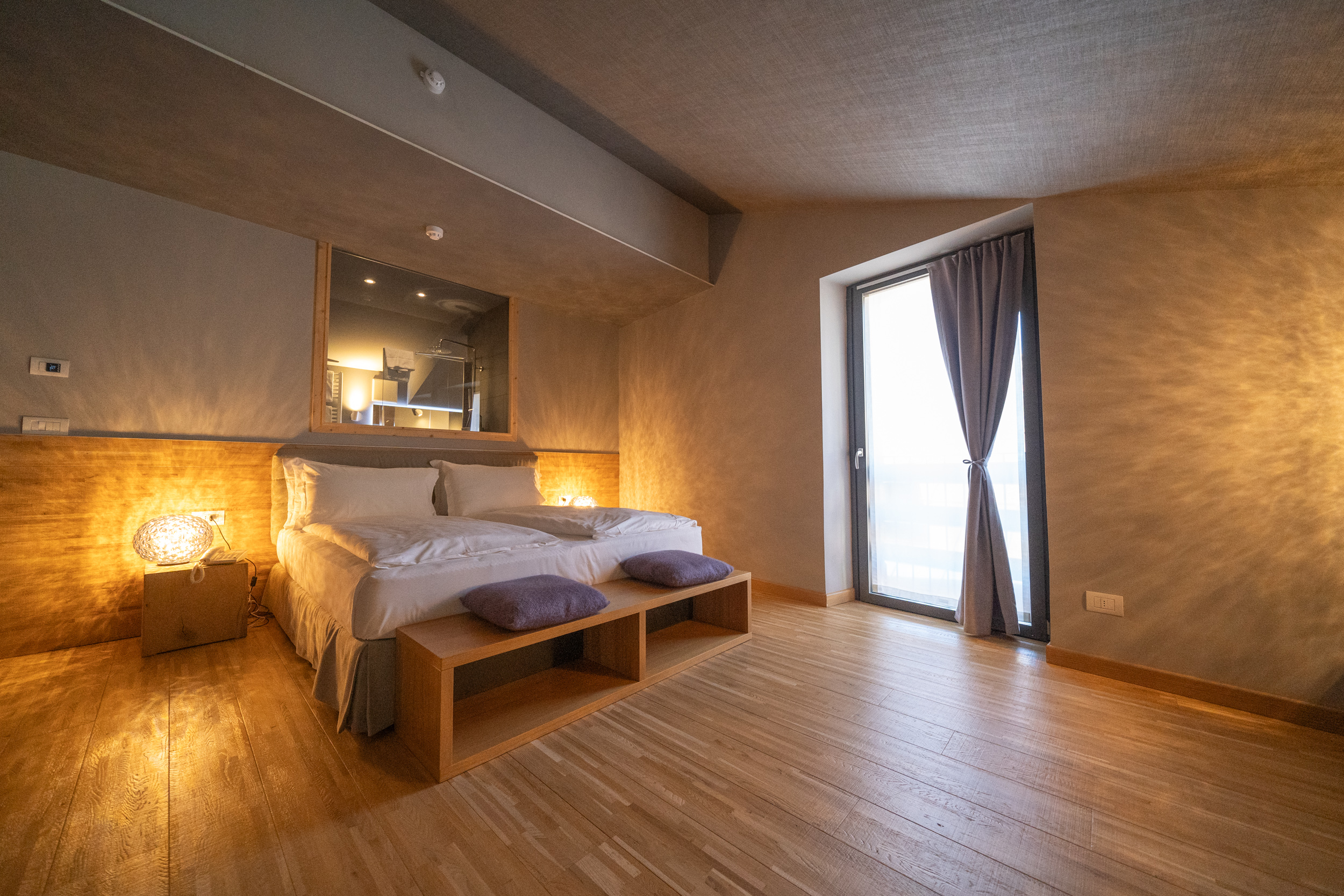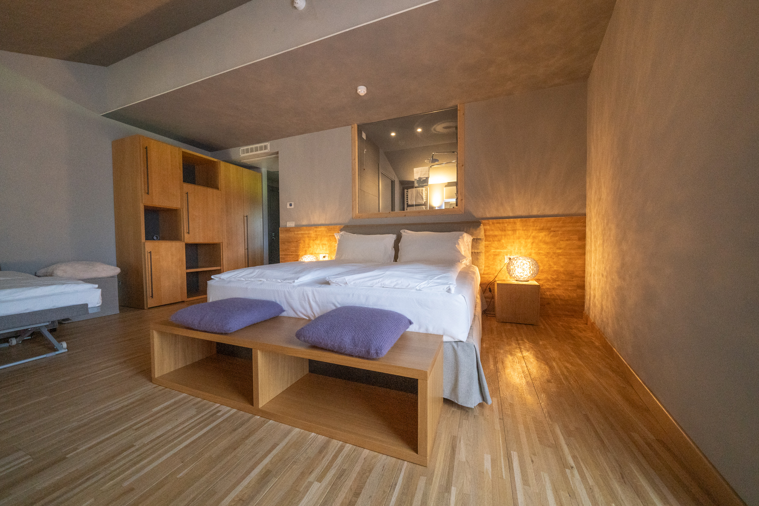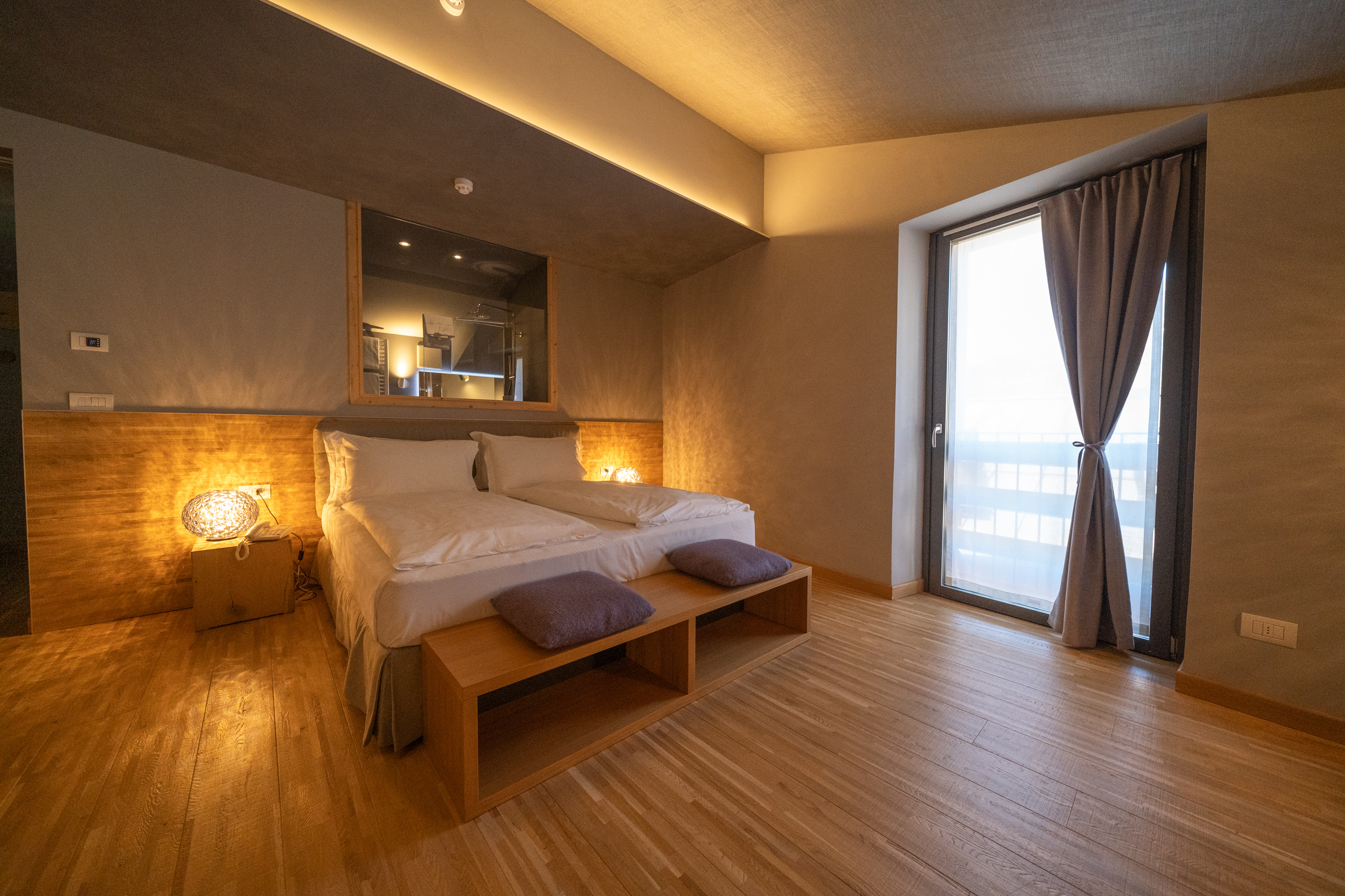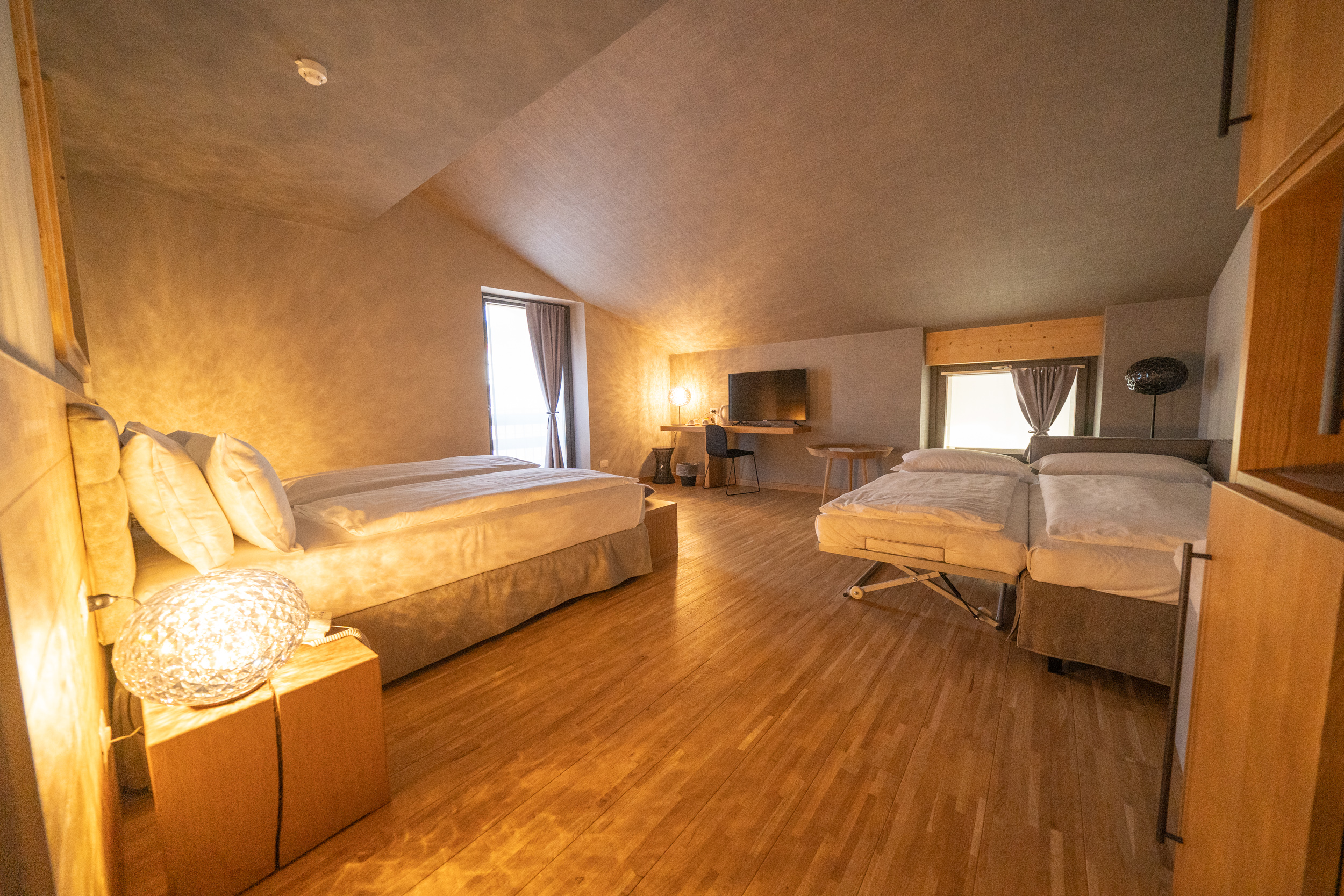 L’ampia camera dall’ arredamento moderno, situata al 2° piano, senza balcone ma con apertura e parapetto. Ospita un letto matrimoniale con letti separabili, divano letto singolo ed eventuale letto aggiunto la stanze si affaccia su borgata Bach. In Stanza troverete, frigo minibar, ciabattine prodotti per l’igiene personale ed asciuga capelli. Su richiesta il lettino da viaggio (0-3 anni). Possibilità di prenotare 2 ore in private spa.