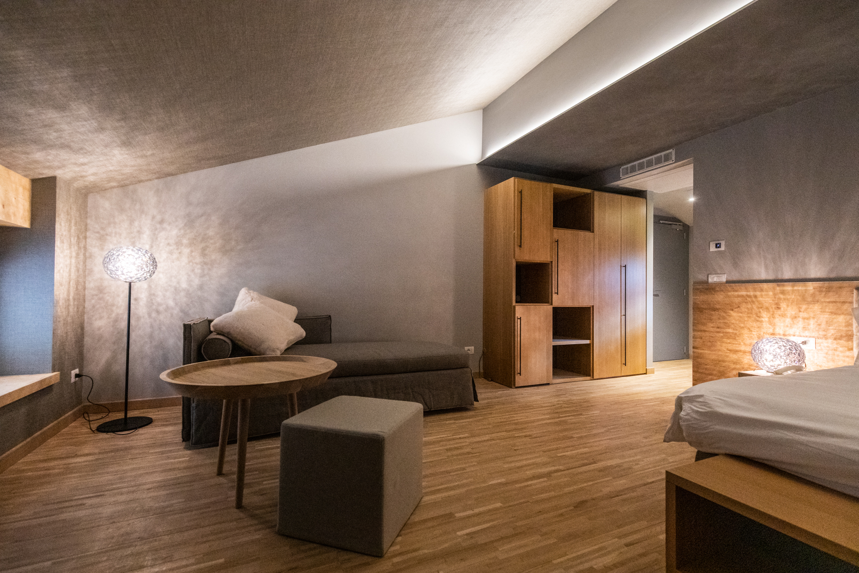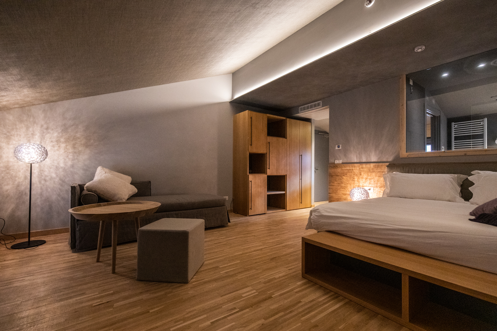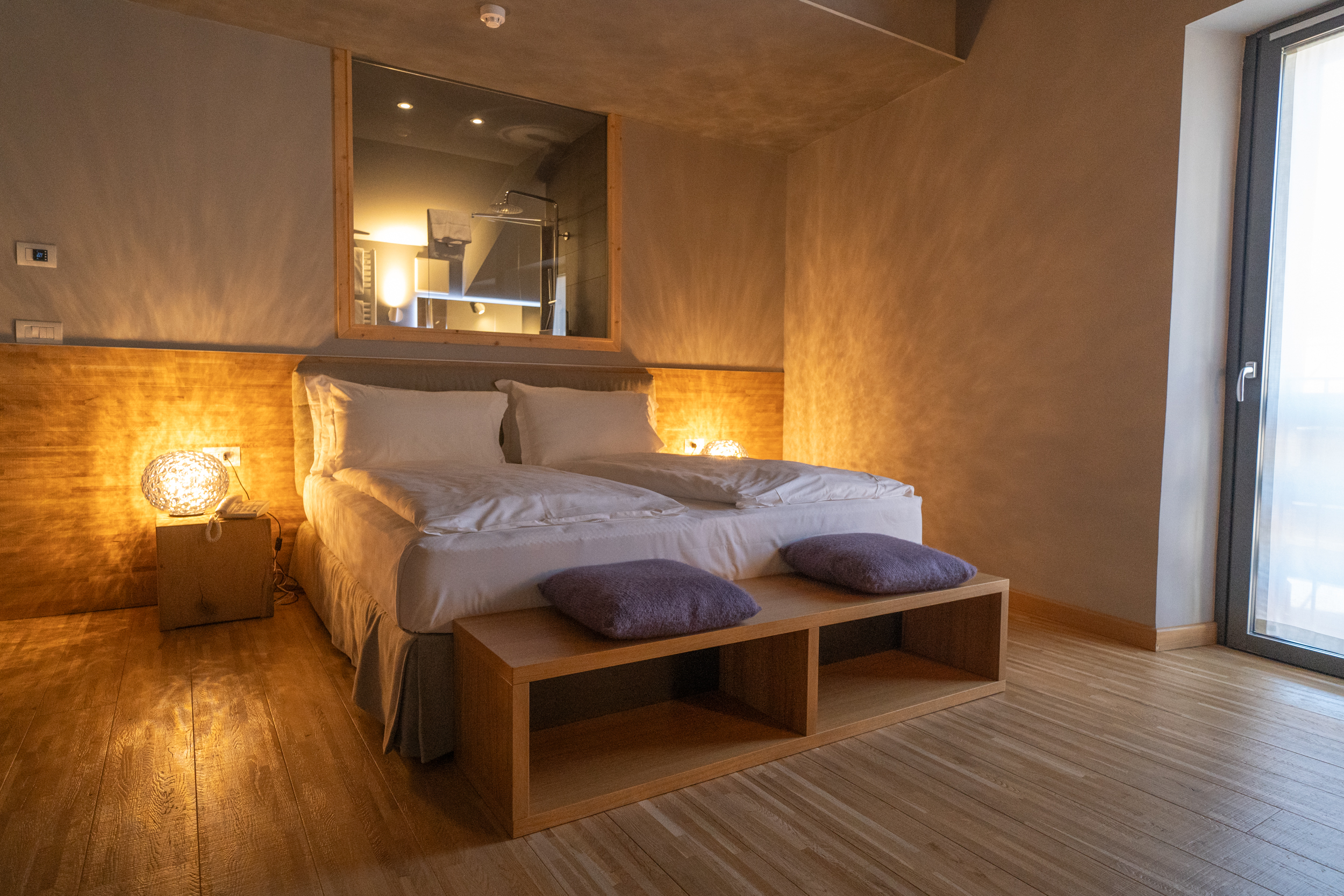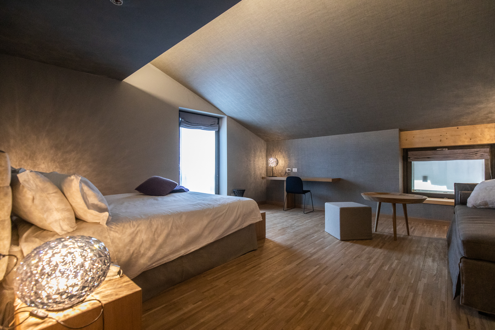L’ampia camera dall’ arredamento moderno, situata al 2° piano, senza balcone ma con apertura e parapetto. Ospita un letto matrimoniale con letti separabili, divano letto singolo ed eventuale letto aggiunto la stanze si affaccia su borgata Bach. In Stanza troverete, frigo minibar, ciabattine prodotti per l’igiene personale ed asciuga capelli. Su richiesta il lettino da viaggio (0-3 anni). Possibilità di prenotare 2 ore in private spa.